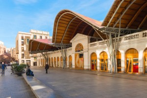 Barcelona Spain – January 26: Marcat de Santa Caterina in Barcelona Spain. People walking and waiting for market to open on sunny day January 26 2014